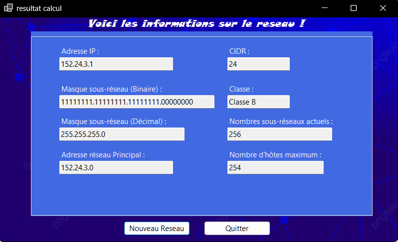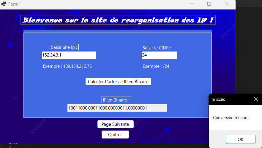 L’application comprend deux interfaces : la première permet la saisie et la validation d’une adresse IP et du CIDR, puis effectue la conversion en binaire. La seconde interface calcule et affiche le masque de sous-réseau (décimal et binaire), l’adresse réseau principale, le nombre d’hôtes maximum, la classe de l’adresse IP et le nombre de sous-réseaux possibles.
